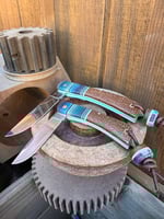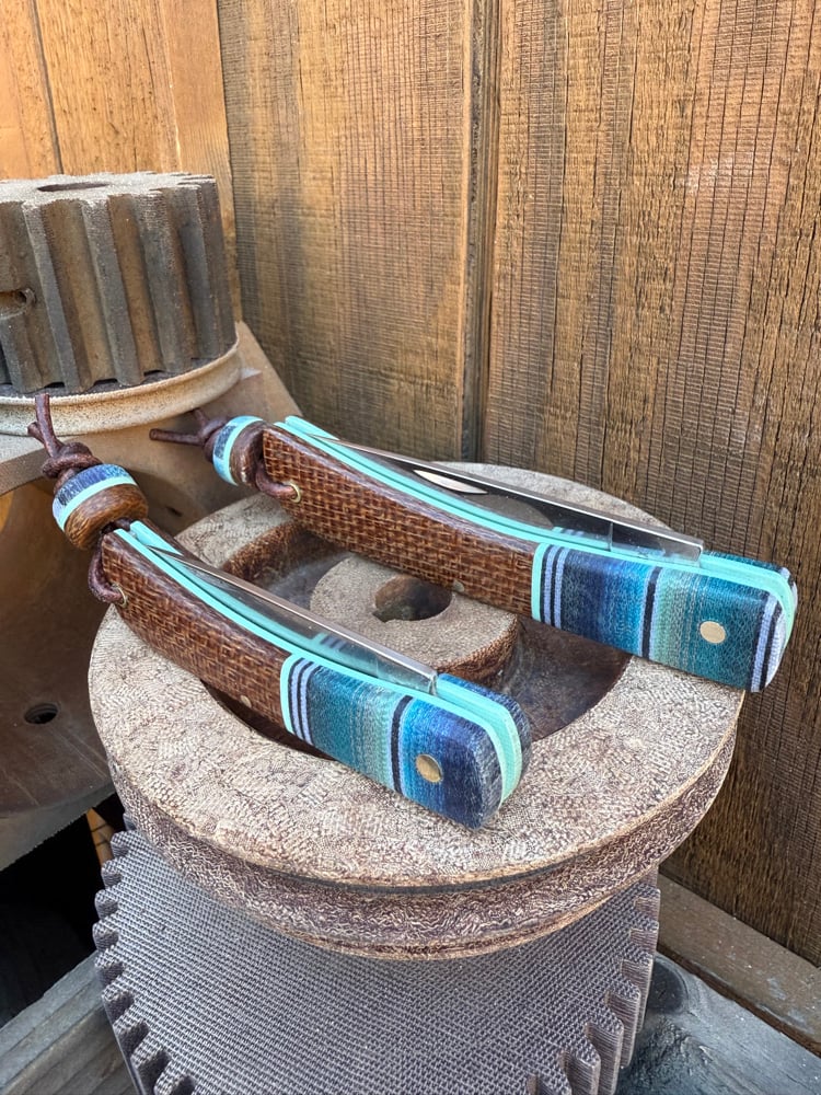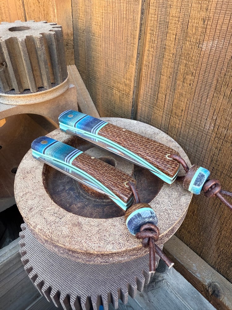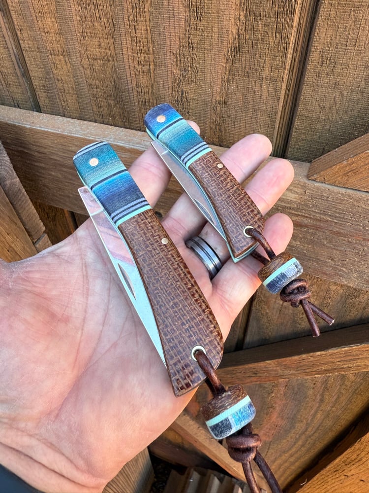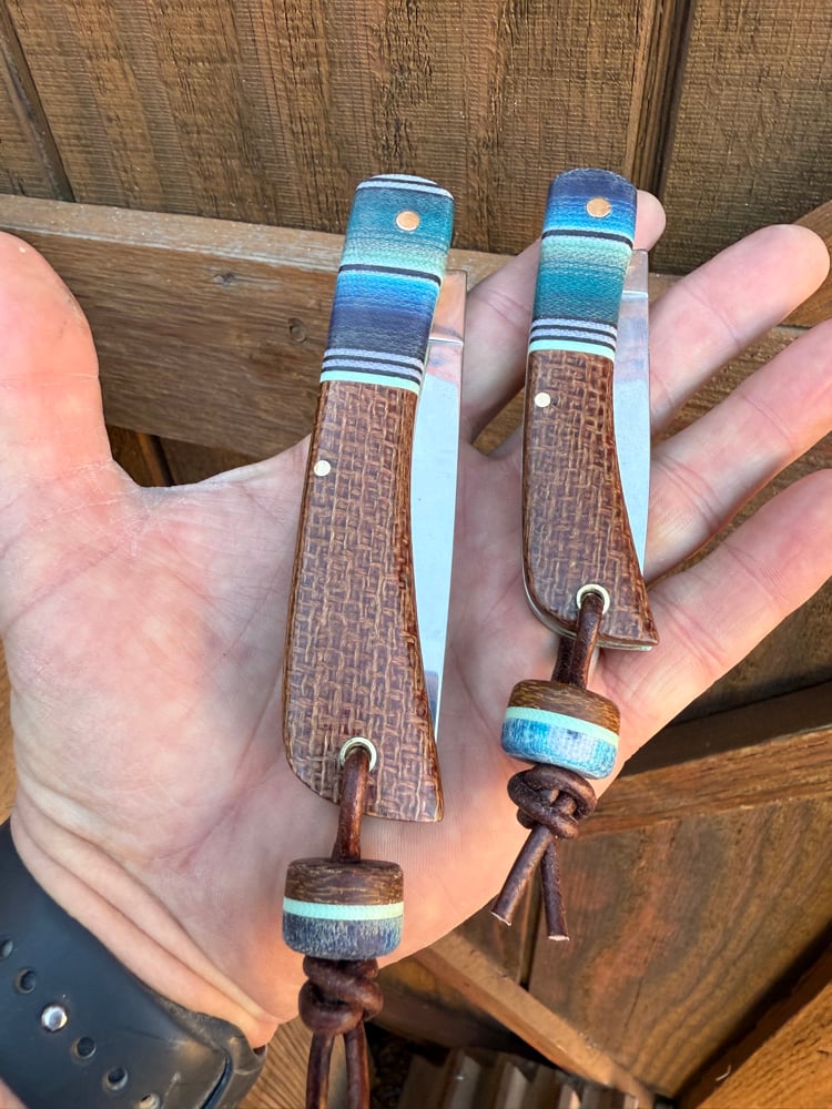 Case sod Buster jr. (Full size in pictures not included) jr only. Dusky especial g-carta, Tiffany g10 and burlap micarta. Added half stop and lanyard tube. Carbon steel blade. New knife. Matching bead.