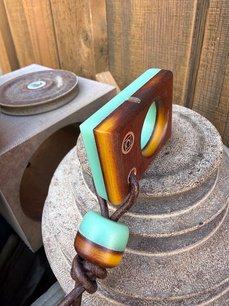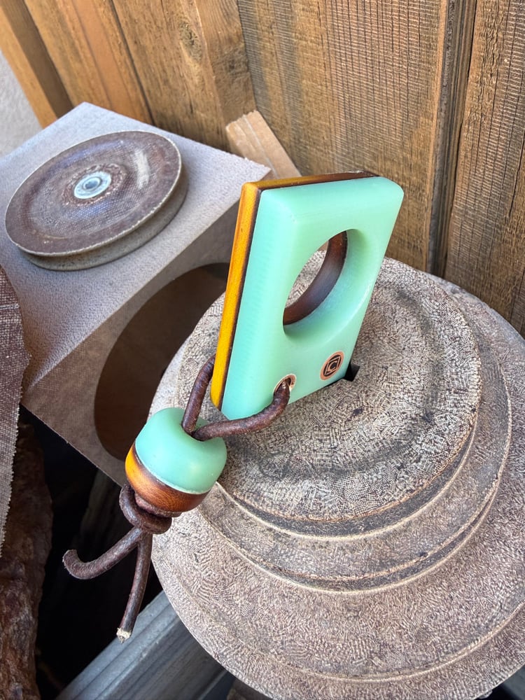Single finger knuckle in opal g10 and vintage linen micarta from an old cabinet. I left part of an original hole on the one edge for character and uniqueness. Beautiful patina on this one.